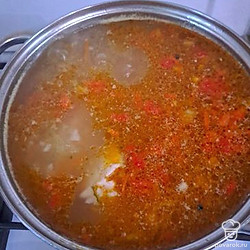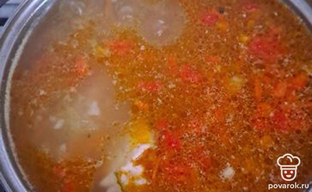 Как только будет готов рис, всю заправку запускаем в рассольник. Как закипит, добавляем лавровый лист, перец горошком, зелень по желанию. Через минутку выключаем.