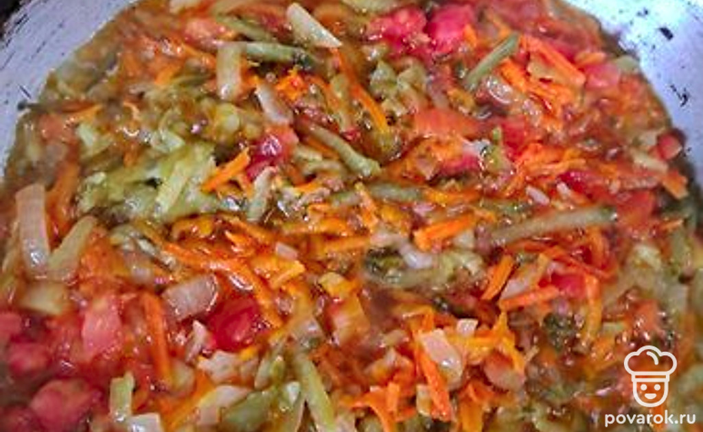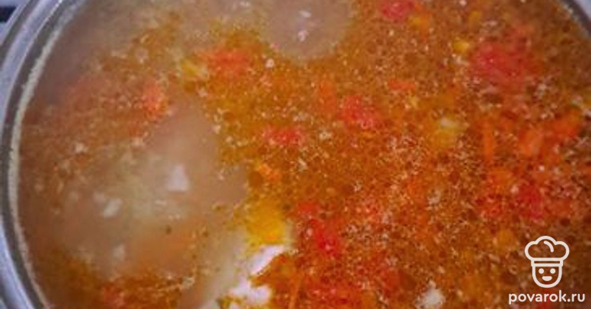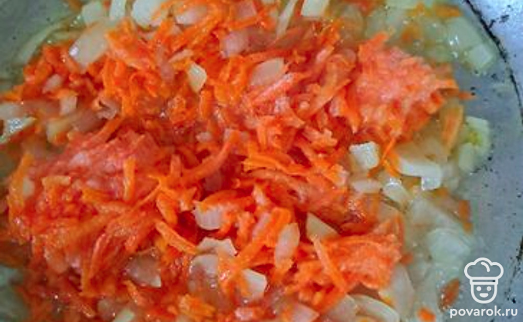 Как только обжарятся лук с морковью, добавляем туда натертые на терке соленые огурцы. Можно добавить один нарезанный помидор. Это придаст вкус и цвет супу.
