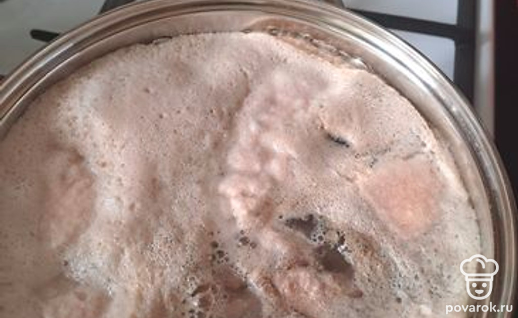 Ставим варить мясо примерно на 1 час. В процессе варки снимаем пену, солим.