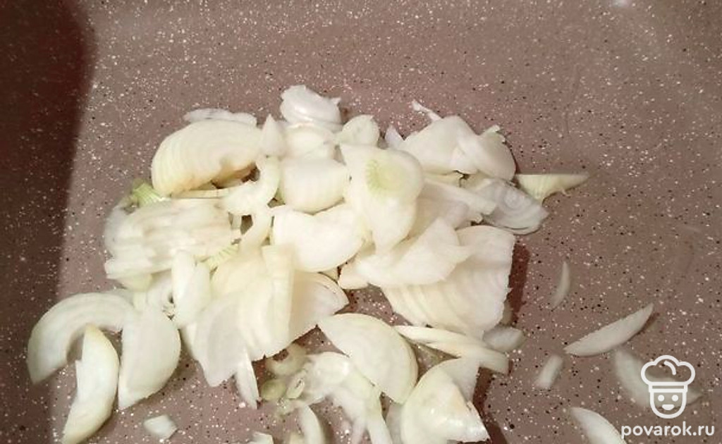 Лук нарежьте полукольцами. На сковороду налейте растительное масло. Выложите лук.
