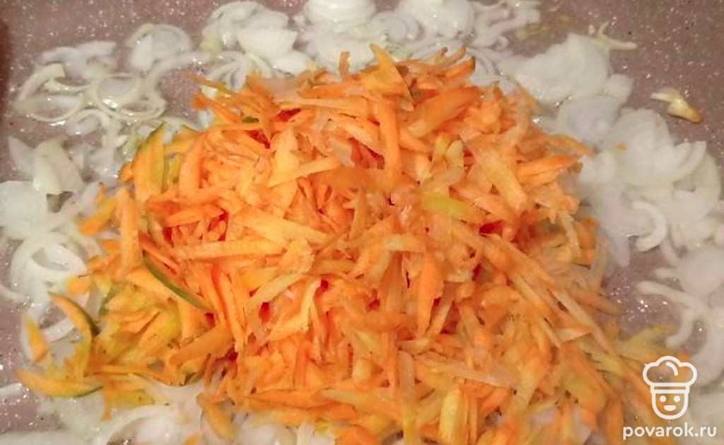 Морковь натрите на крупной терке. Добавьте к луку и обжарьте до золотистого цвета, помешивая.