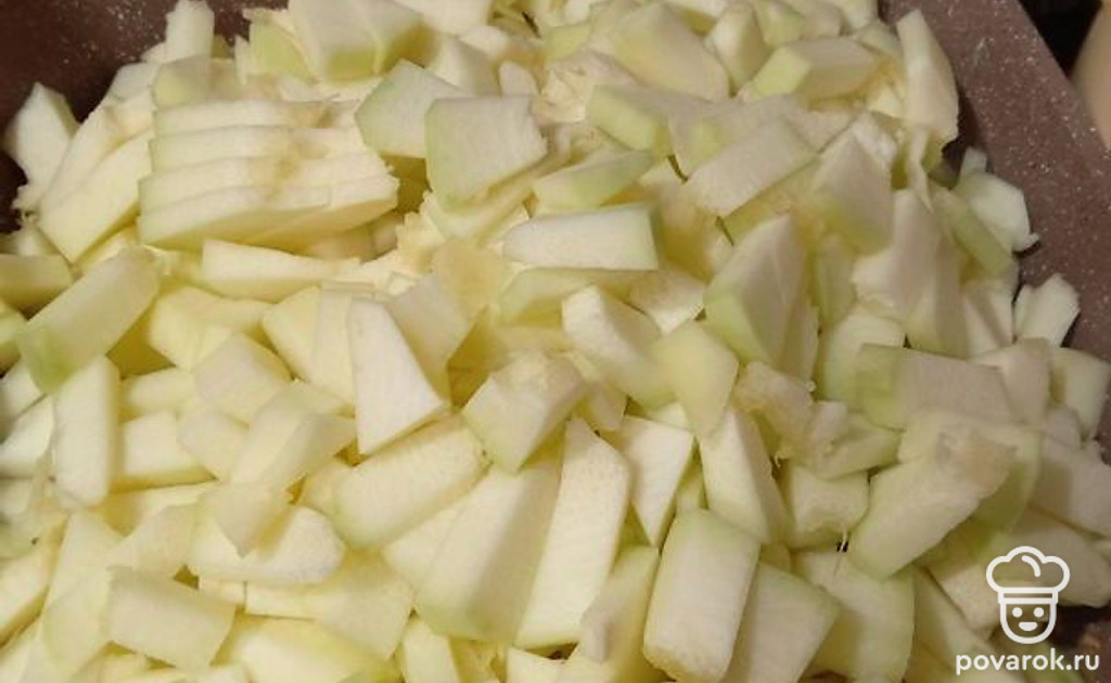 Кабачки помойте, очистите от кожуры, уберите семена. Нарежьте кубиком.