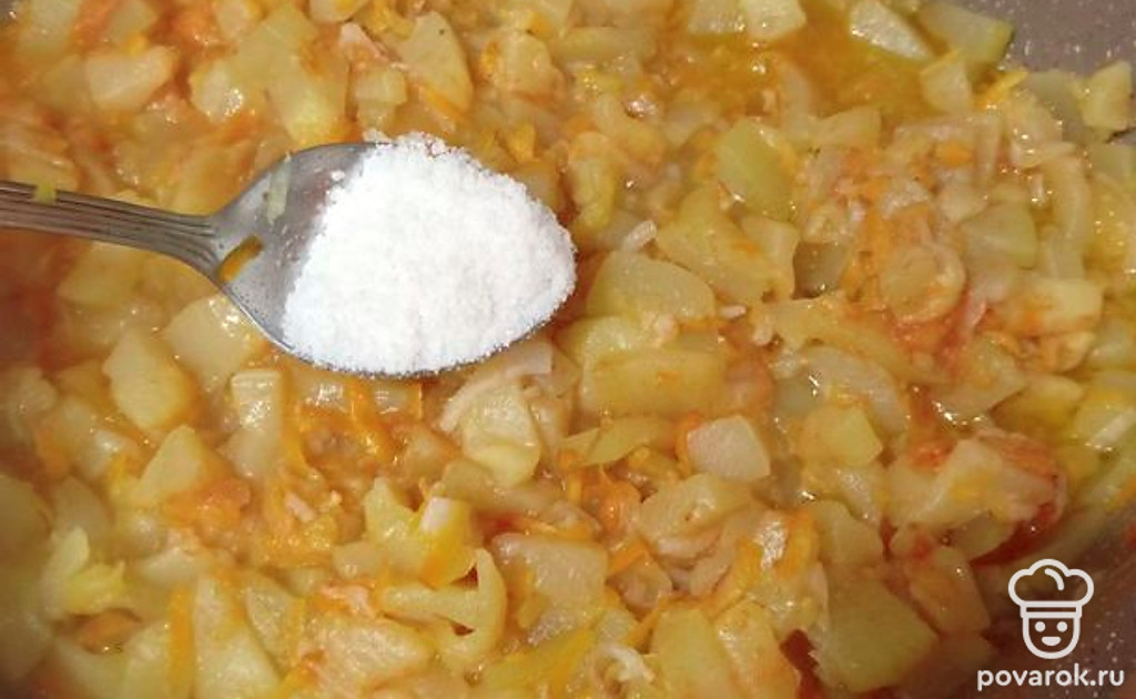 Добавьте кабачки, тушите под крышкой 1 час, постоянно помешивая (или пока не испарится лишняя жидкость).