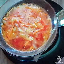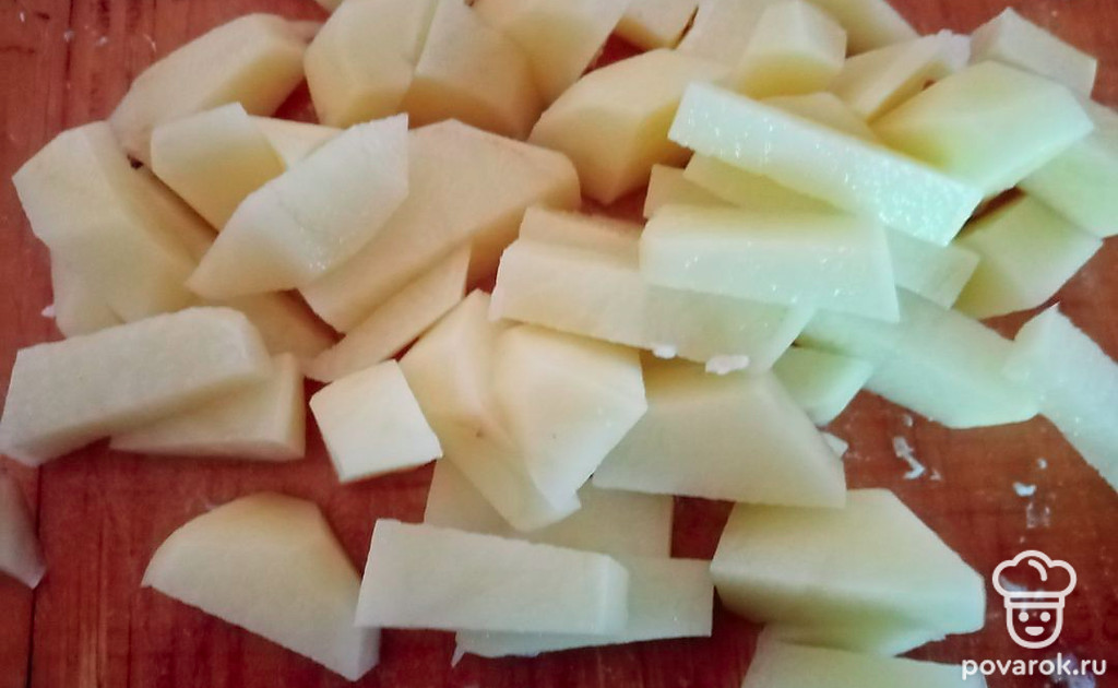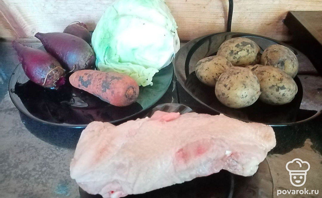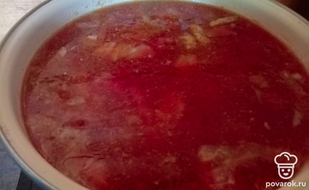 Когда картошка почти готова, положить в кастрюлю зажарку из свеклы и моркови. Посолить, поперчить. Варить до готовности картофеля.