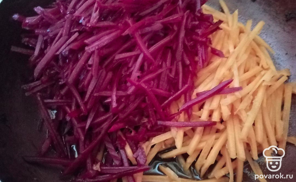 Морковь и свеклу натереть на терке для корейской моркови. Обжарить минут 20 на медленном огне.