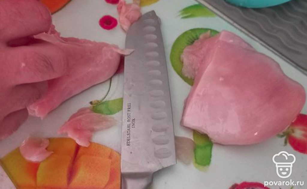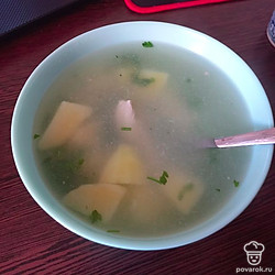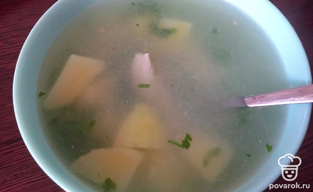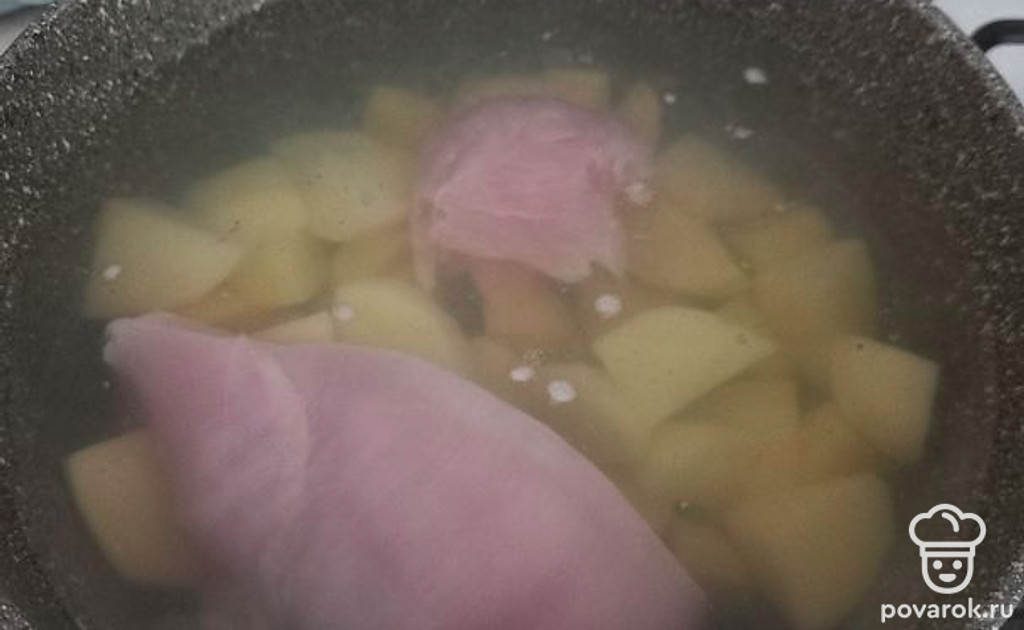 Отвариваем до готовности. После того, как мясо сварилось, режем его на мелкие куски и добавляем обратно в суп.
