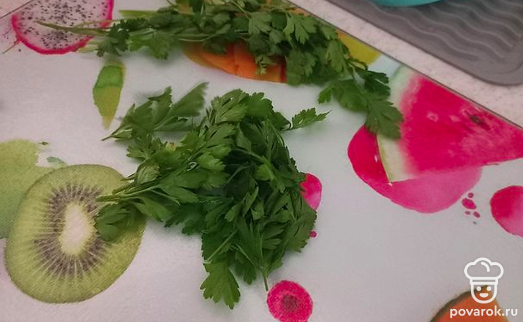 Бульон приправляем специями и приправами по вкусу. За 5 минут до готовности добавляем лапшу и лимонную кислоту. В конце нарезаем петрушку, выкладываем в суп. Закрываем крышкой и оставляем так на пару минут.