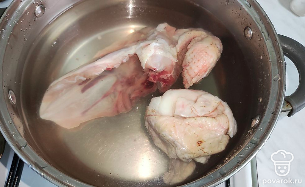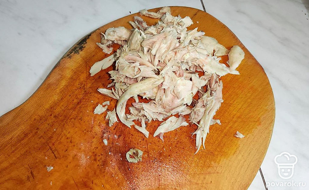 Отварите бульон на куриных косточках. После закипания варите 40 минут на слабом огне, затем достаньте мясо из бульона.