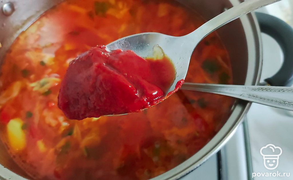 Приправьте томатной пастой, перемешайте. Варите на слабом огне 5-7 минут.