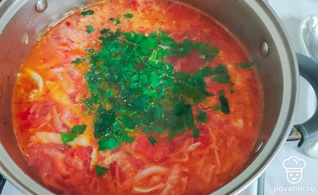 Свежую зелень мелко нарежьте и добавьте в борщ. Посолите по вкусу. Выключите газ.