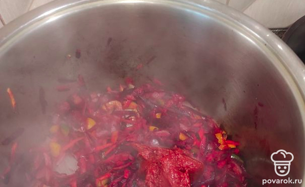 Добавить нарезанную морковку, перец, свеклу, томатную пасту.