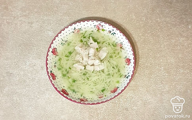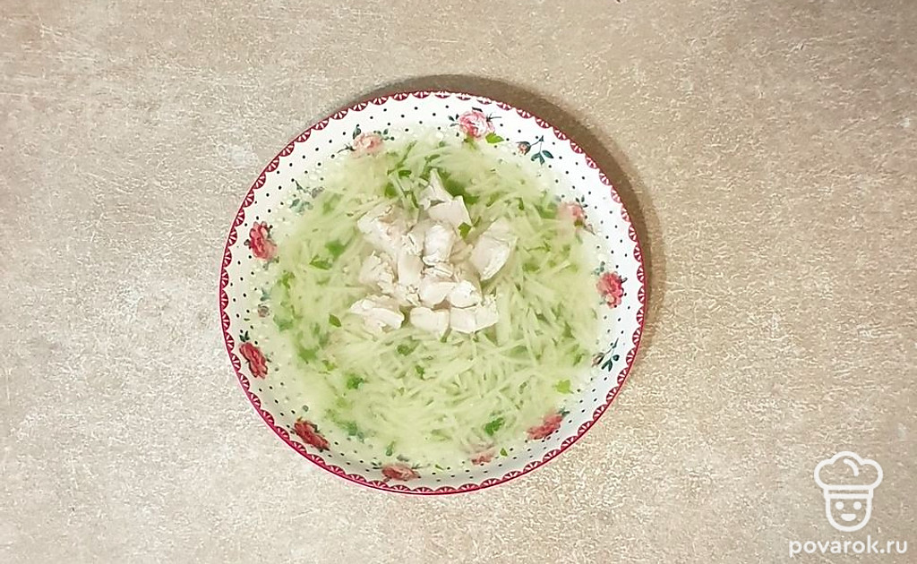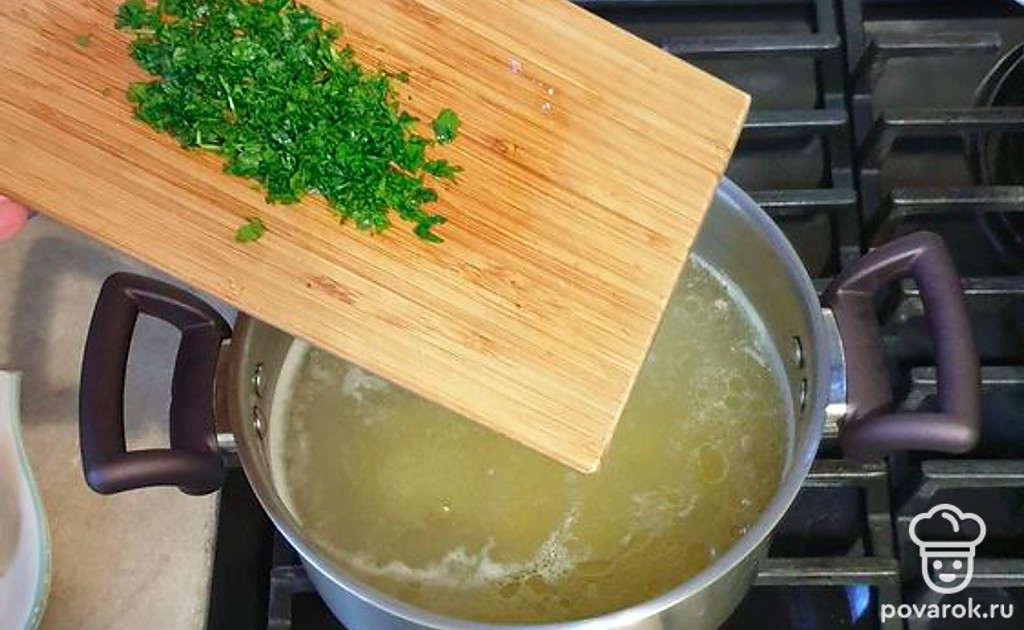 Петрушку мелко нарежьте и отправьте в бульон вместе с нарезанным куриным филе. Дайте прокипеть около двух минут.