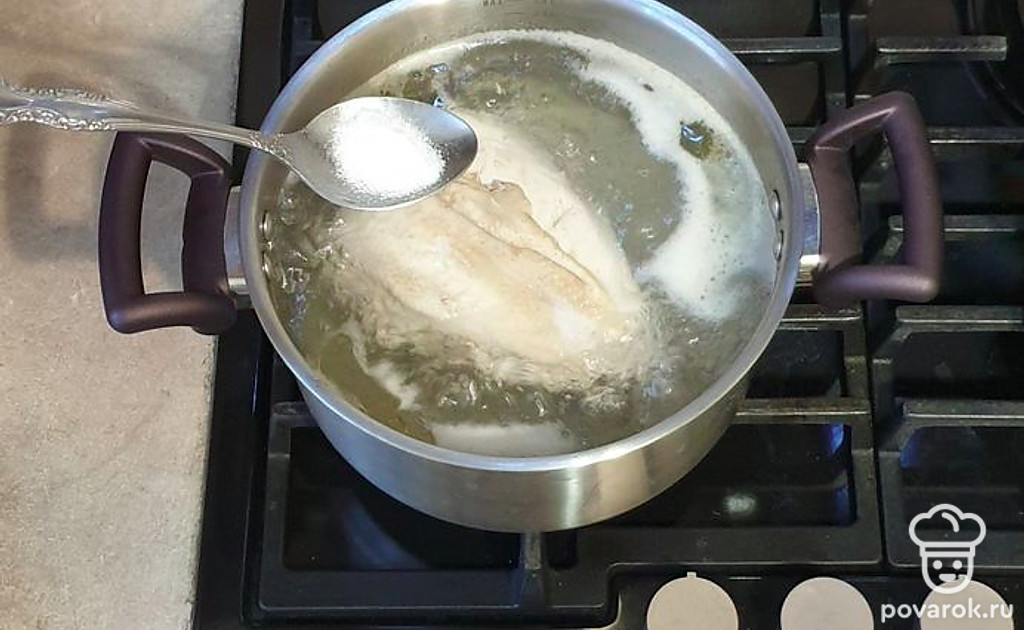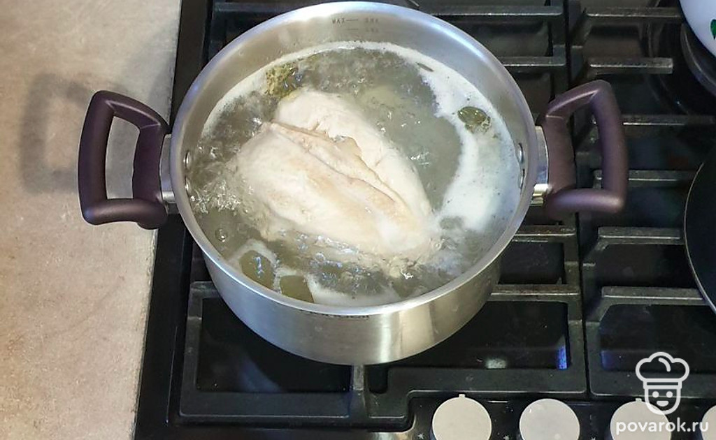 Куриное филе промойте, положите в кастрюлю и залейте холодной водой. Варите на среднем огне.