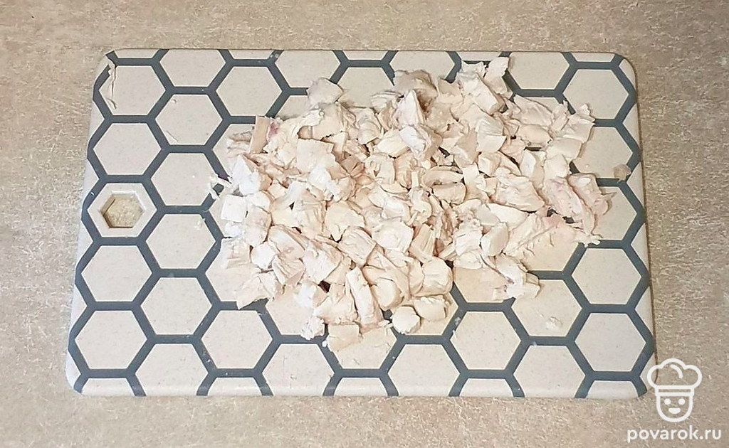 Готовое куриное филе достаньте и слегка остудите. Нарежьте небольшим кубиком.