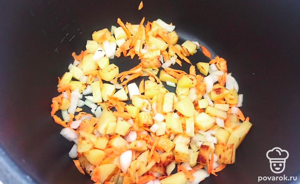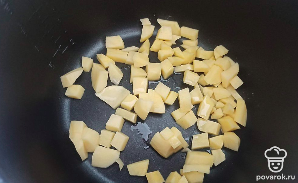 Картофель нарежьте кубиками и обжарьте на подсолнечном масле в чаше мультиварки 8 минут.