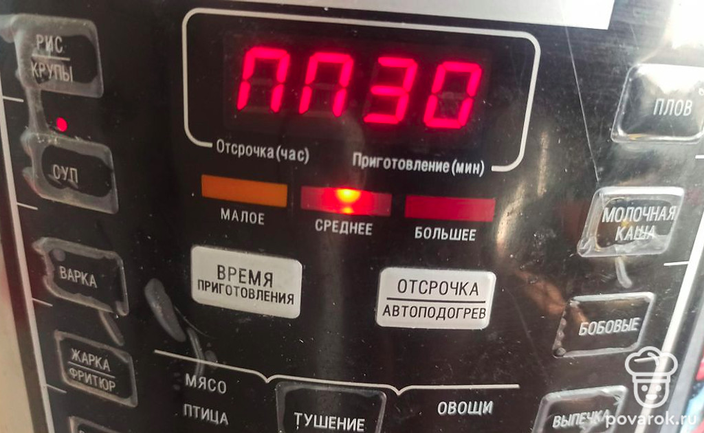 Влейте 1,5 литра воды и поставьте вариться на режиме «Суп» (у меня это 30 минут).