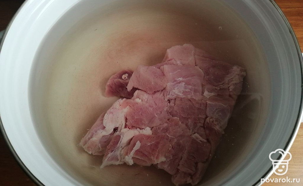 Свинину заливаем холодной водой.
