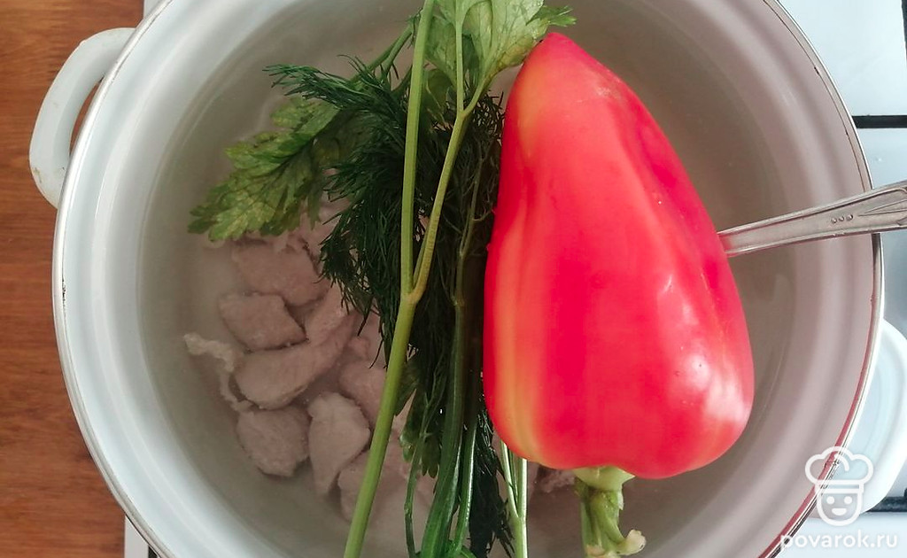 Из супа убираем зелень и целый болгарский перец. Добавляем зажарку и варим 10-15 минут.