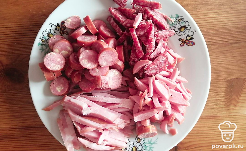 Колбасные изделия нарезаем произвольно.