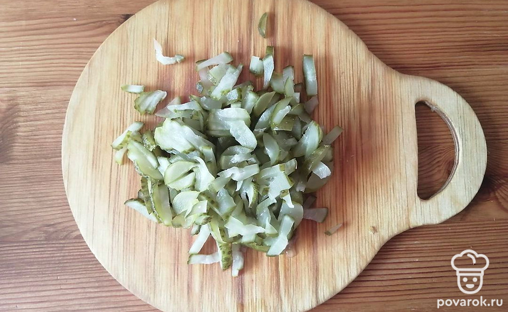 Соленые огурцы нарезаем соломкой.