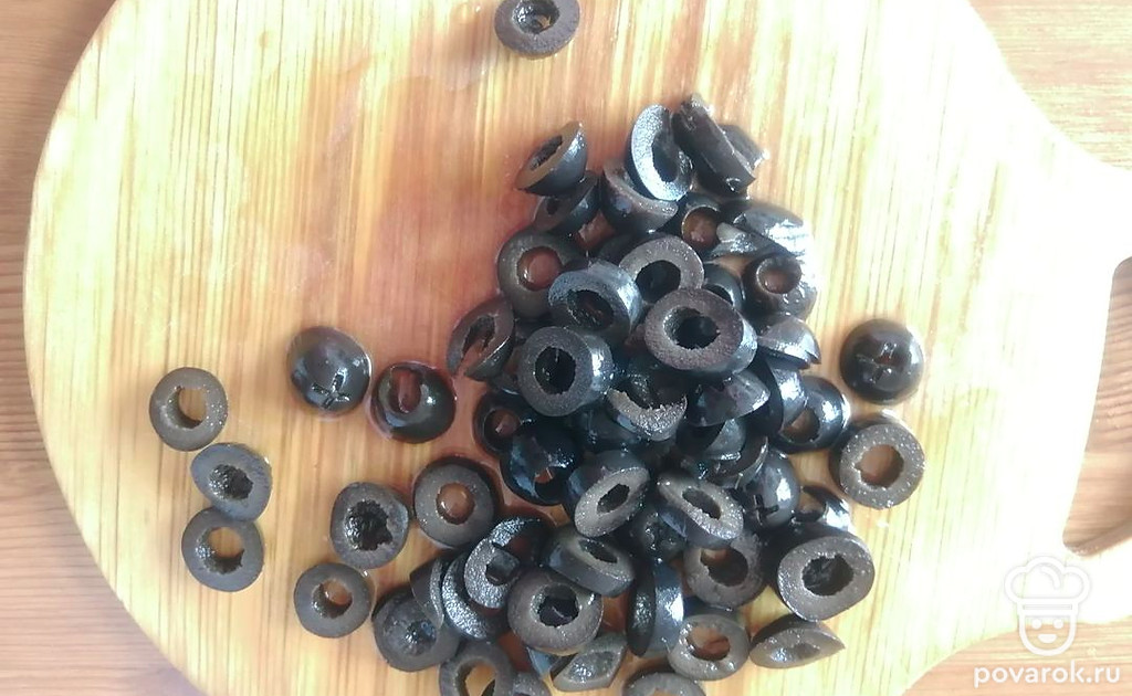 Маслины нарезаем колечками.