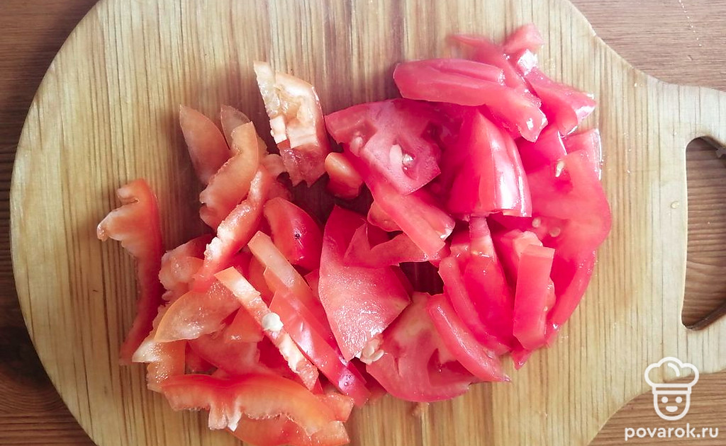 Помидор и перец болгарский нарезаем произвольной формы.