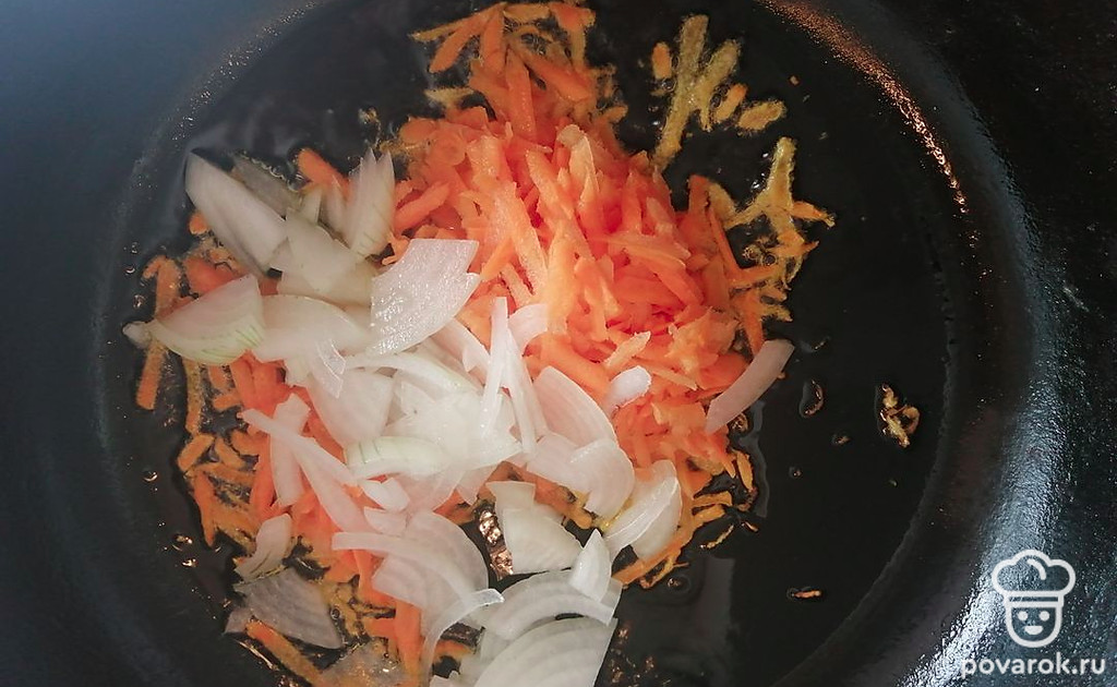 На сковороде обжариваем натертую морковь и нарезанный лук.