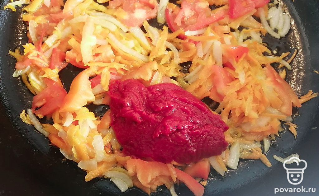 Добавляем помидор, перец и томатную пасту. Хорошо все перемешиваем.