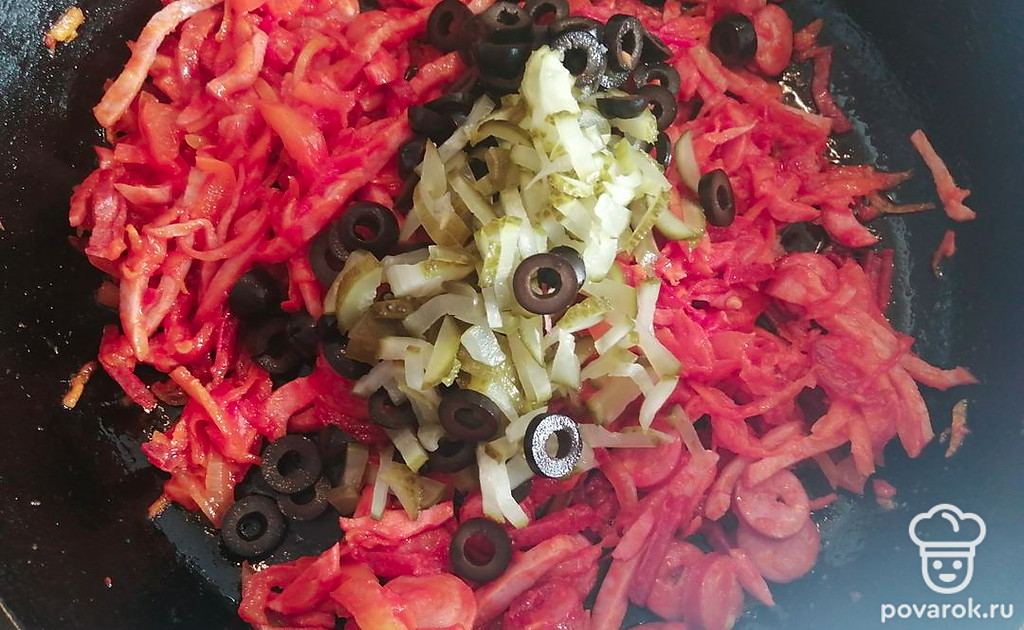 Добавляем колбасные изделия, огурцы, маслины. Тушим 5-7 минут.