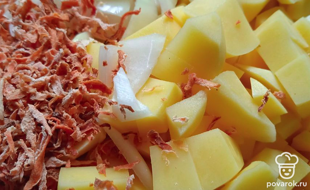 Добавьте нарезанный картофель, лук, сушеную морковь. Варите еще минут пятнадцать. Посолите по вкусу.