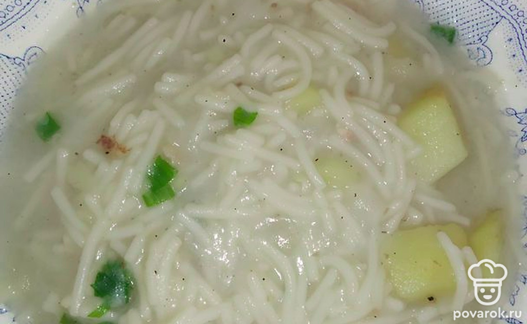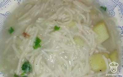 Налить воду в кастрюлю, положить говяжьи косточки, лавровый лист, соль, перец. Через полчаса после закипания бульона добавить картошку, лук. За 10 минут до готовности выложить вермишель. Перемешивать по мере надобности.