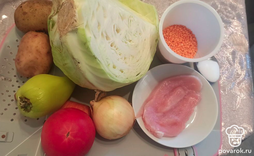 Картошку чистим и нарезаем. Мясо индейки нарезаем на небольшие кусочки. Выкладываем в кастрюлю картошку, мясо индейки и чечевицу.