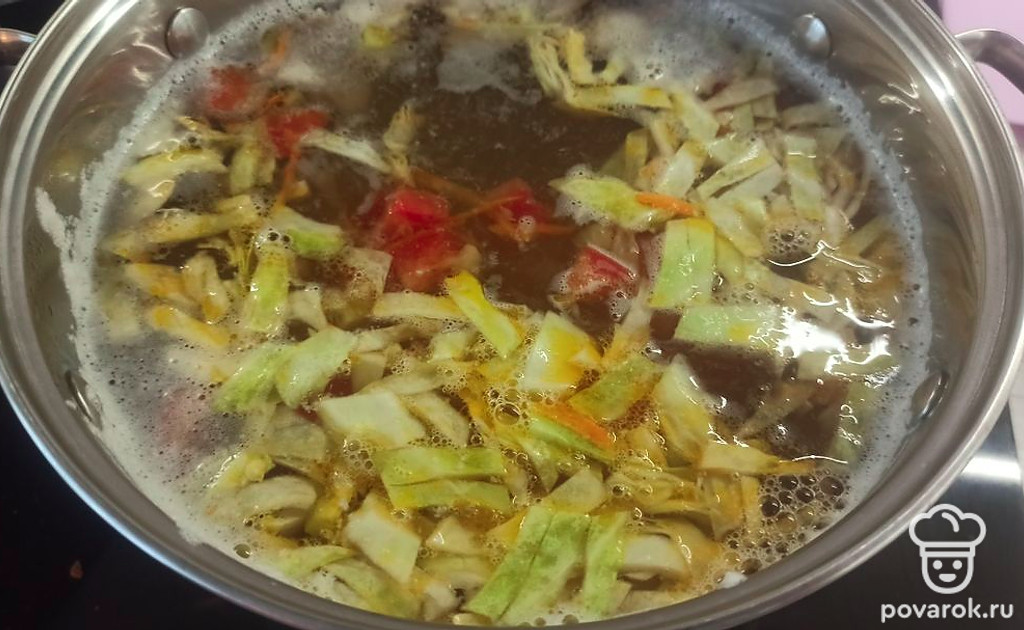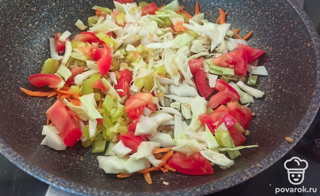 Затем тонко шинкуем капусту, нарезаем помидор и перец. Добавляем овощи в сковороду и тушим 10 минут.