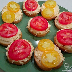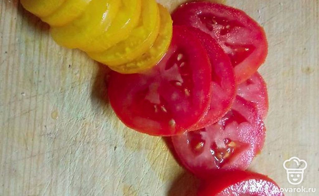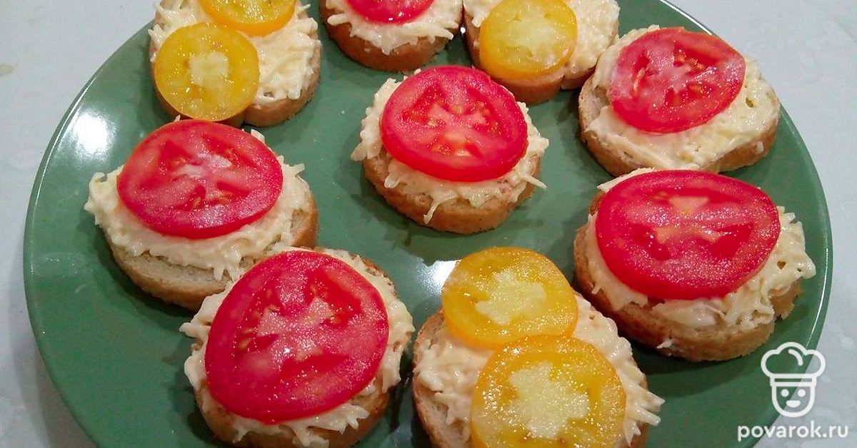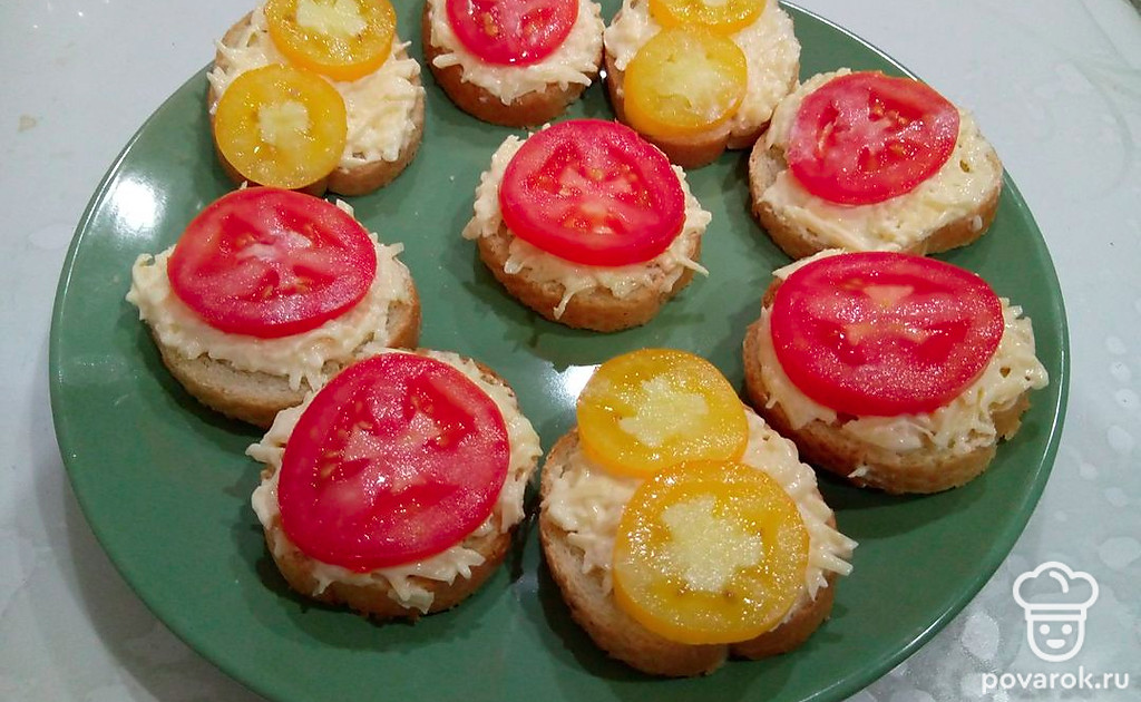 Помидоры помойте и нарежьте тонкими кружочками. Выложите по 1-2 кружочка на бутерброды. Готовые бутерброды выложите на блюдо для подачи.