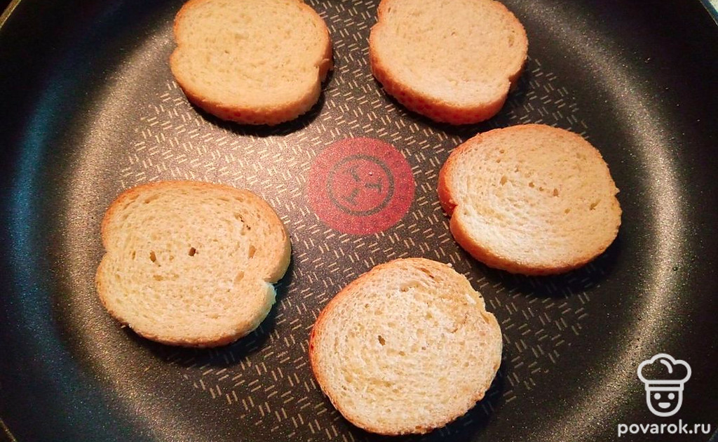 Батон или багет нарежьте ломтиками толщиной 1 сантиметр. Подсушите на сухой сковороде (с каждой стороны примерно по 2-3 минуты).