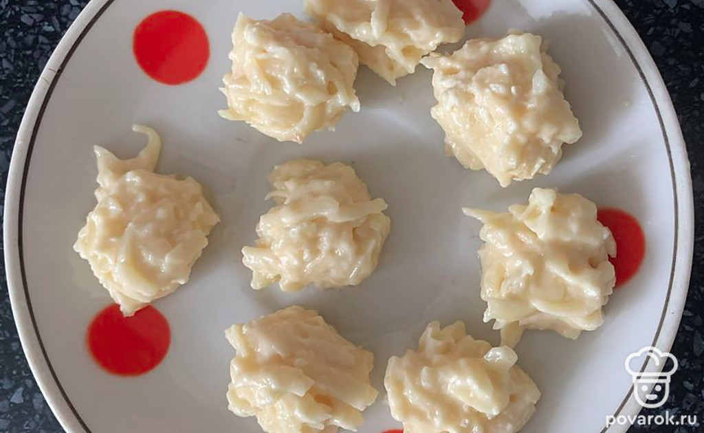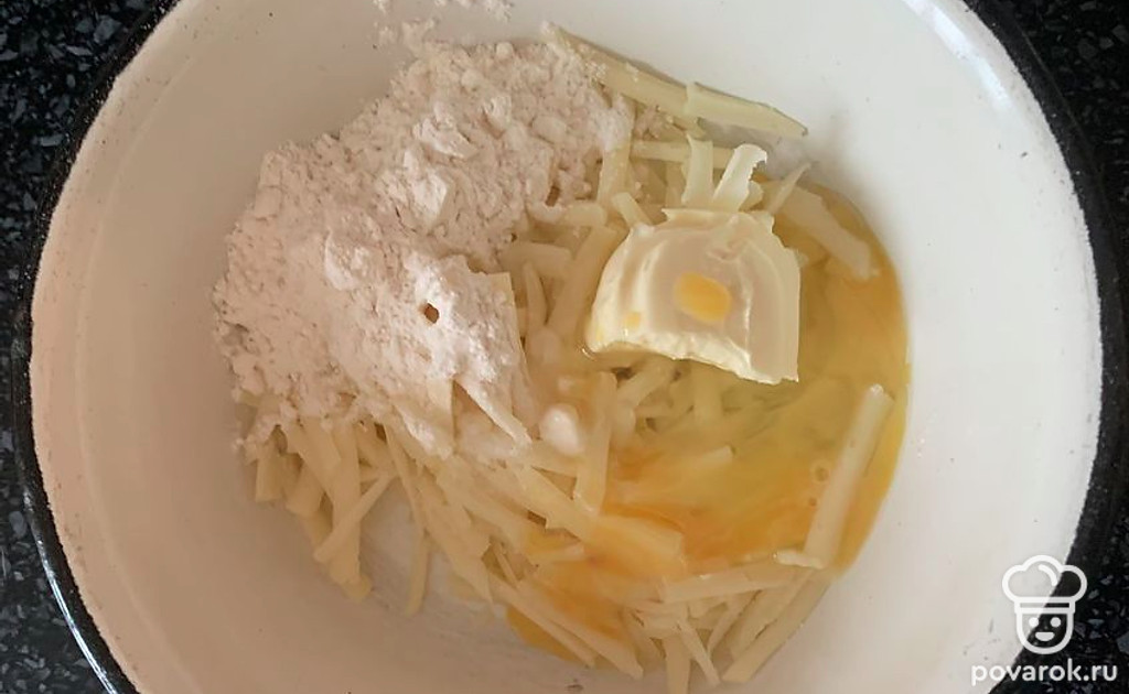 К сыру добавить яйцо, сливочное масло, муку, соль. Все перемешать и отправить в холодильник.