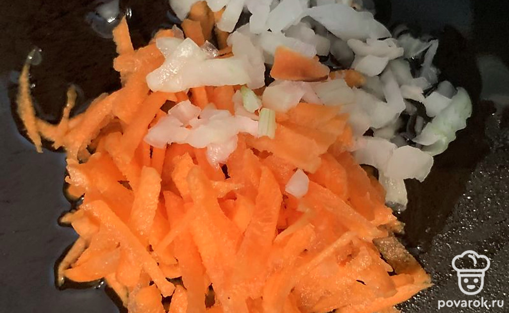 Лук нарезать, морковку натереть на терке и обжарить на сковородке.