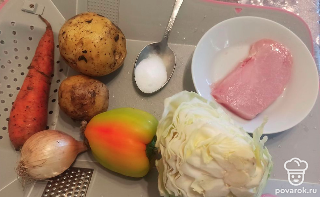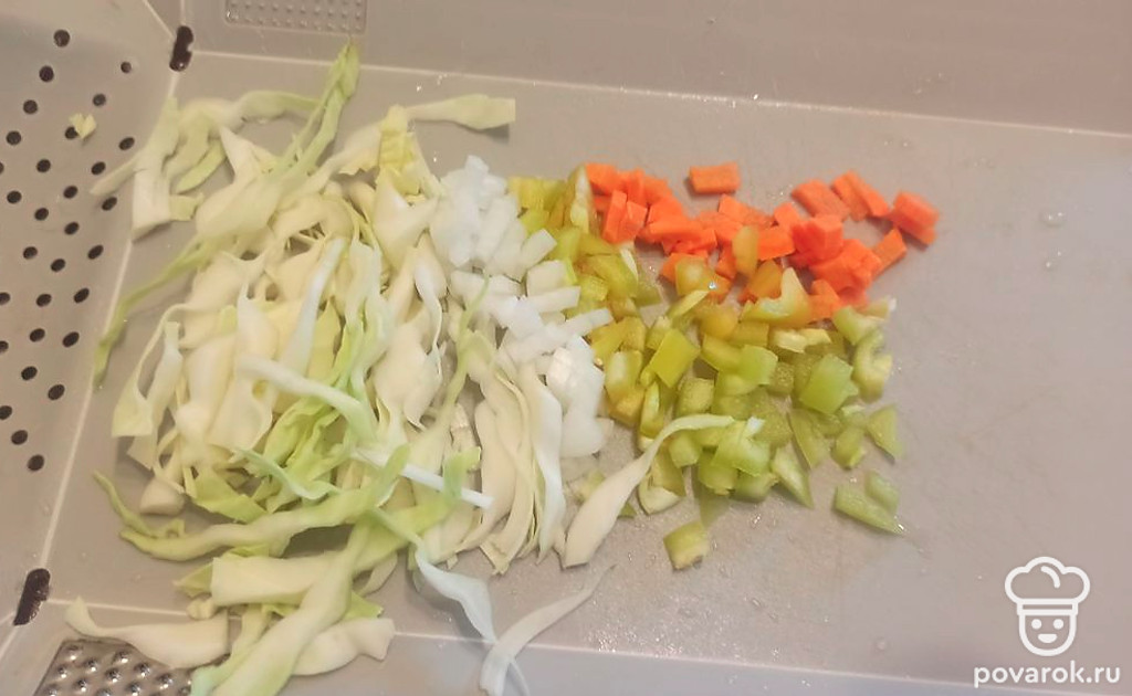 Нарезаем лук, морковь, перец кубиками. Капусту тонко шинкуем.