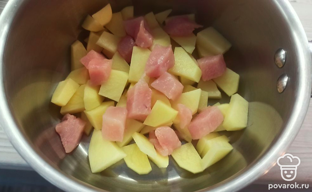 Картошку чистим и нарезаем. Мясо нарезаем небольшими кусочками.