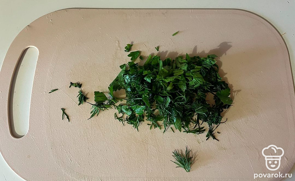 Добавьте нарезанную зелень, перемешайте и выключите огонь.