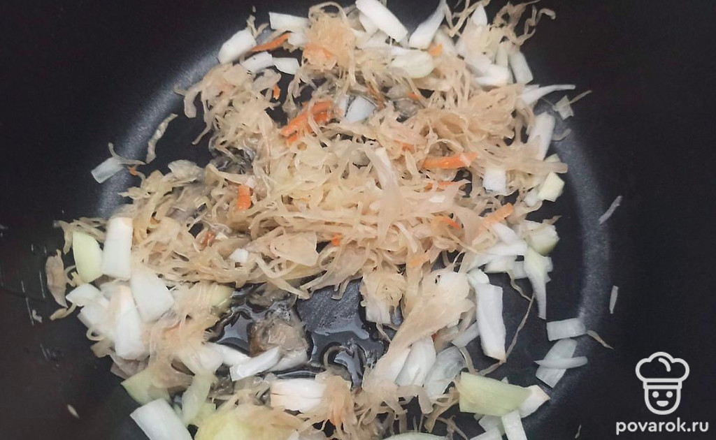 Лук нарежьте кубиками и обжарьте на подсолнечном масле вместе с квашеной капустой 5 минут.