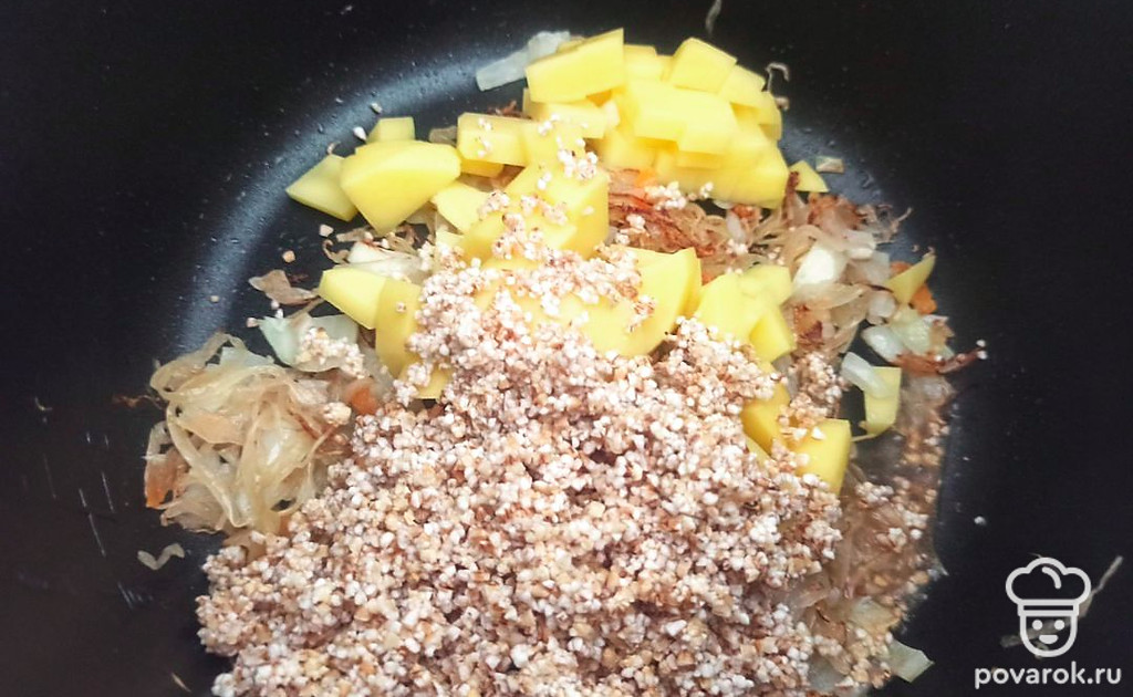Картошку нашинкуйте мелкими кубиками, крупу промойте и добавьте к овощам.