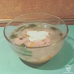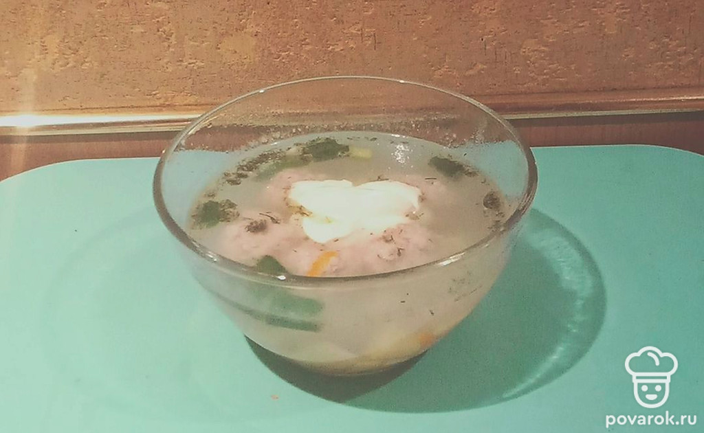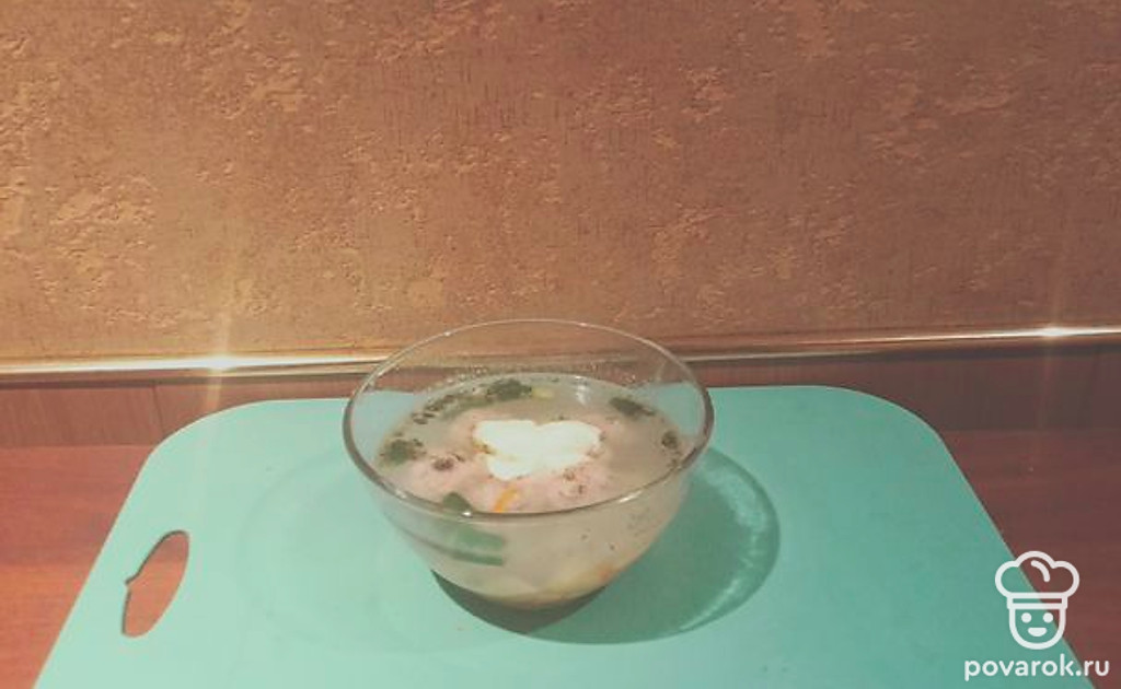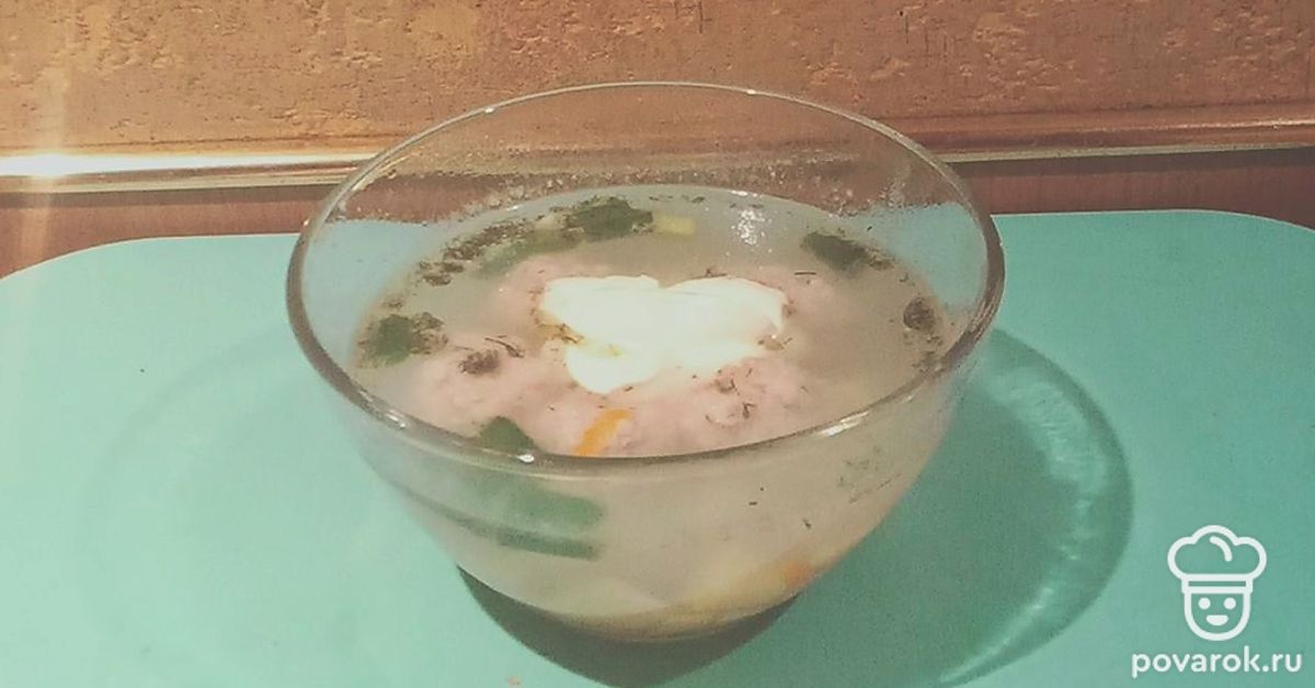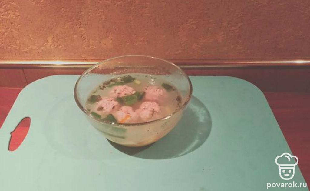 Бросьте в закипевшую воду картофель, морковь и варите до полуготовности. Положите в суп фрикадельки и варите до готовности овощей. По окончании варки выложите в кастрюлю зеленый лук и сухой укроп. Суп готов.
