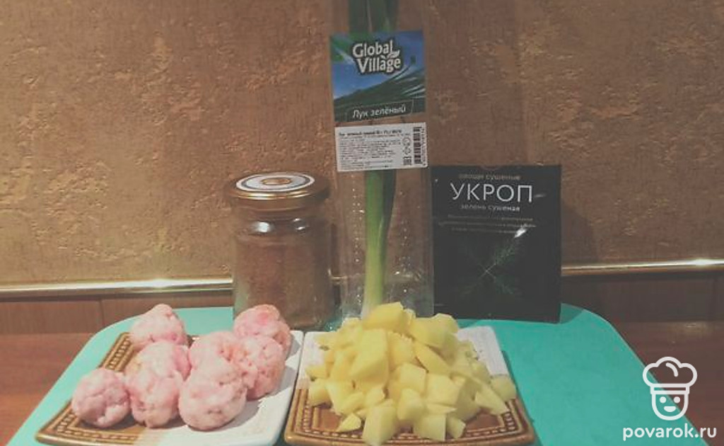 Очистите картофель, нарежьте на средние кусочки. Посолите фарш. Натрите чеснок на крупной терке. Нарежьте зеленый лук. Слепите небольшие фрикадельки. Поставьте греться около литра воды, доведите до кипения.