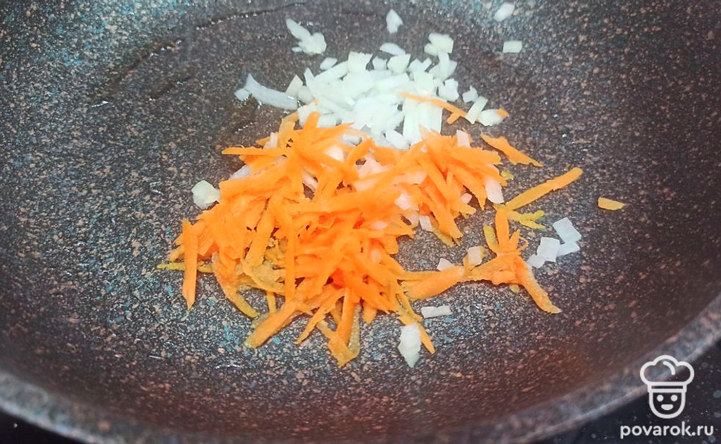 Репчатый лук и морковь чистим. Лук нарезаем кубиками, морковь натираем на крупной терке. Обжариваем на растительном масле.