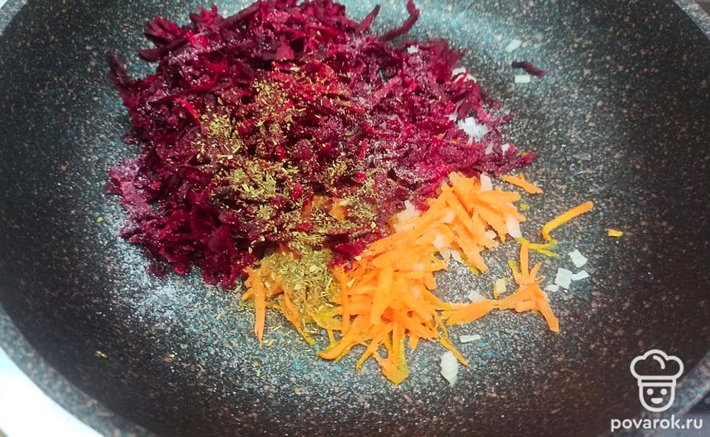 Затем натираем свеклу на крупной терке, добавляем соль и специи.