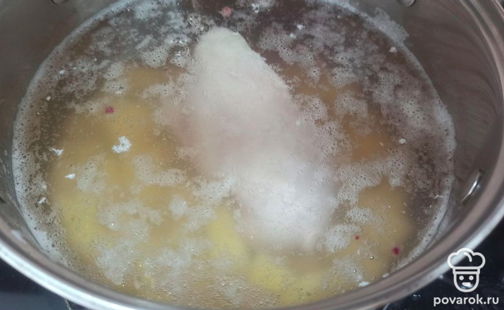 Далее добавляем курицу в кастрюлю и продолжаем варить.