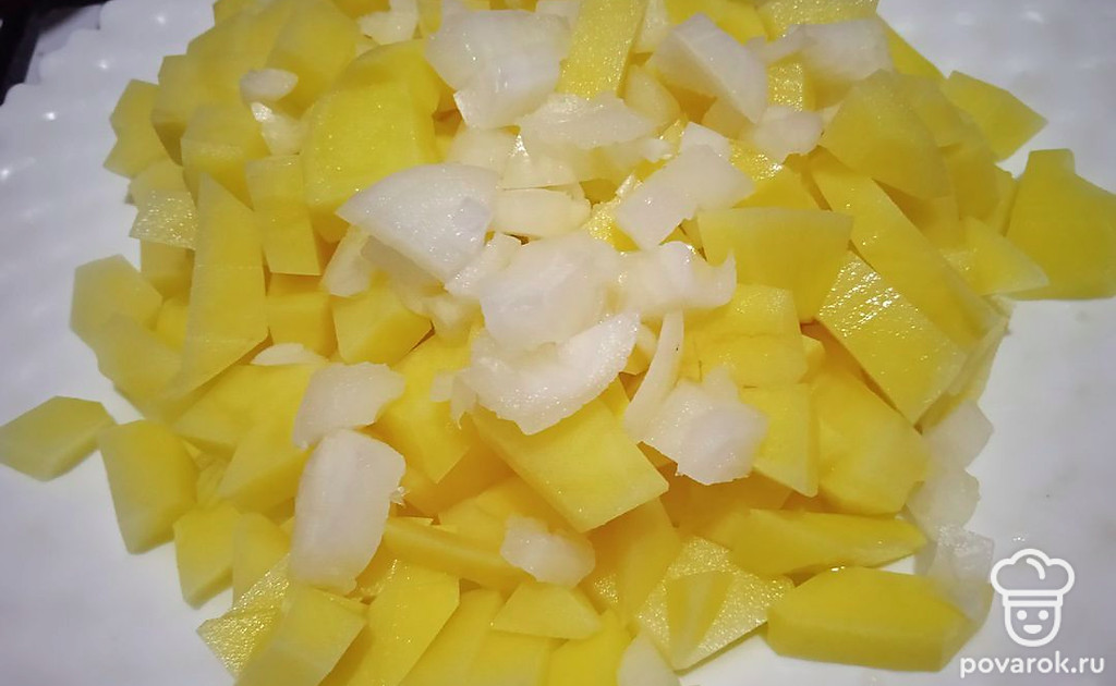 Добавьте нарезанный картофель и лук. Варите еще пятнадцать минут.