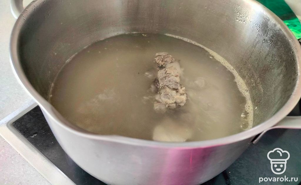 Сварите говяжий бульон. В бульон положите мелко нарезанный картофель. Варите еще 10 минут.