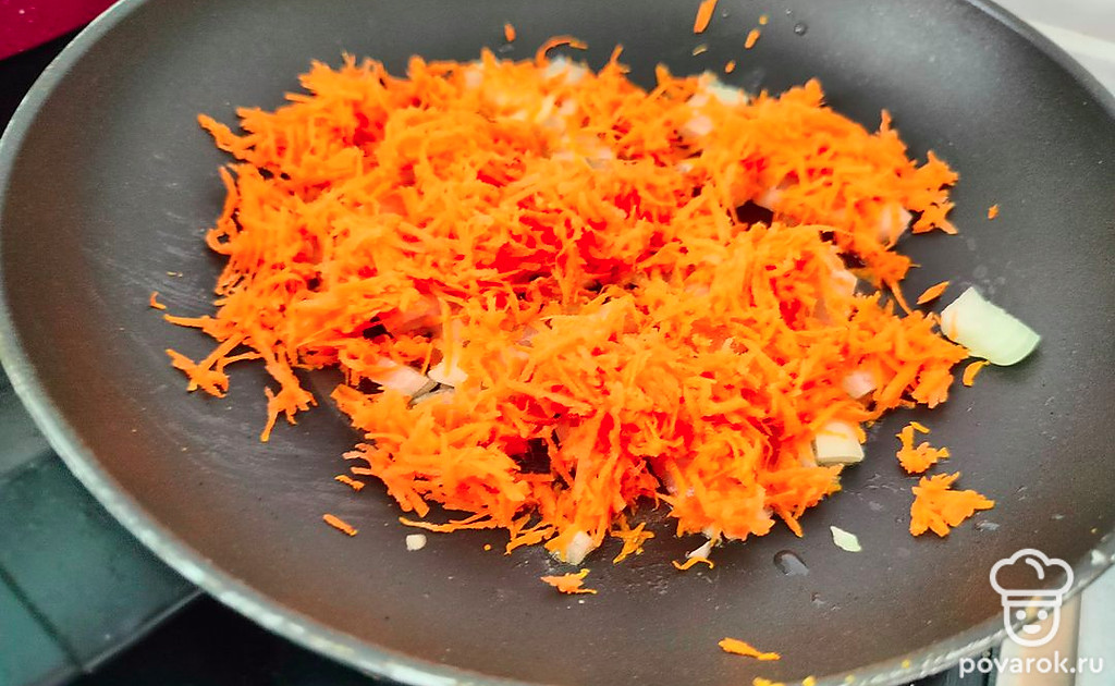 Приготовьте зажарку. Обжарьте мелко нарезанный лук и тертую морковь.